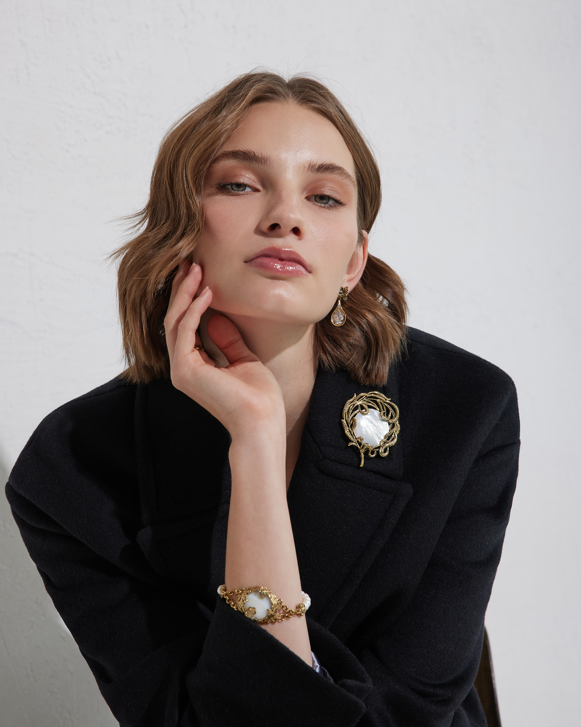 Feather choker / brooch with mother-of-pearl insert. Composition: hypoallergenic alloy-brass, mother-of-pearl, patination, handmade. Color: antique gold, white. Size: 6.5 x 5 cm, chain 70 cm