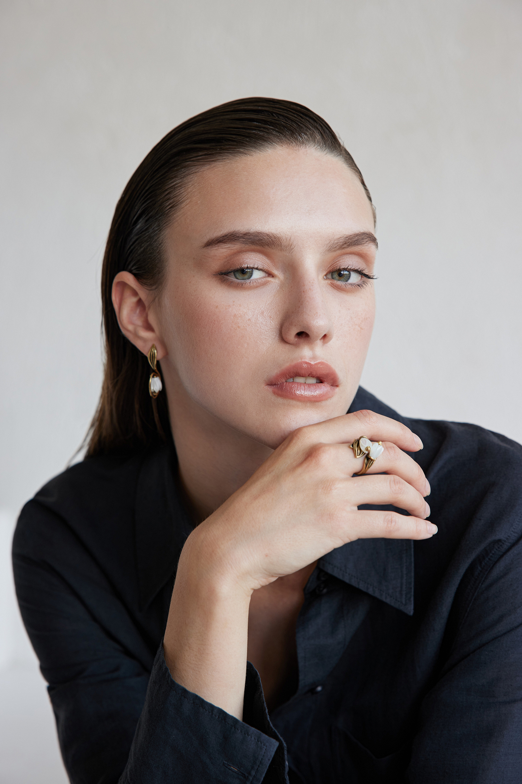 TENEREZZA handmade ring. Tenderness in the language of flowers is a symbol of purity, fidelity and love for the most sublime feelings. Italian design. Composition: Brass (brass), electroplated coating - nanoceramics, patination, mother-of-pearl. Size: universal, the ability to arrange the shank from 16 - 19 RUS. Color: antique gold, white. Weight 5.87 gr.
