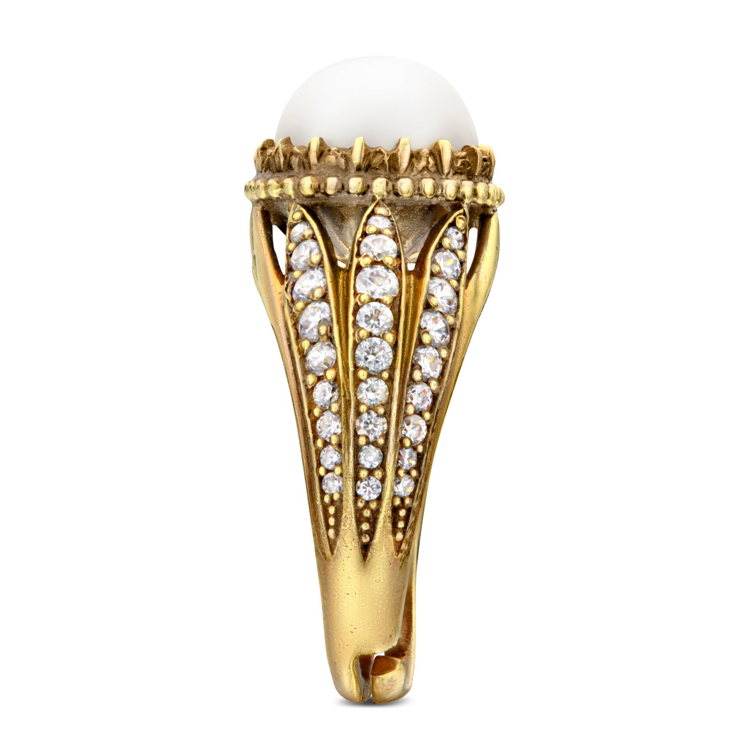 Delicate ring-flora, plant elements of the shinki inlaid with cubic Zirconia support the pearl in a decorative frame, handmade. Size: universal, the ability to place the tire from 16.5 to 18.5.