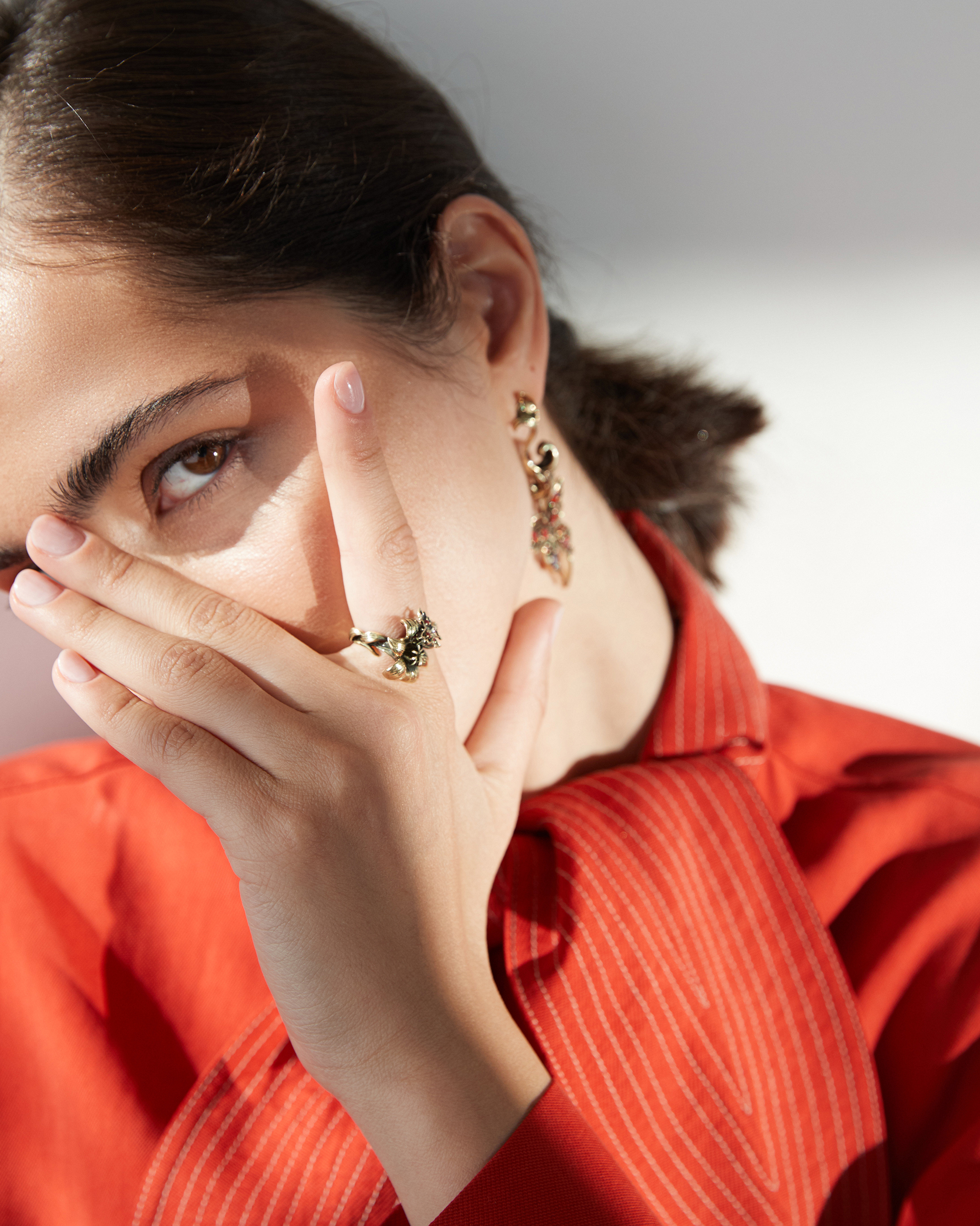 Handmade ring "FARFALLE" with zirconia cubica inserts. Italian design. Composition: Brass (brass) with electroplated coating, cubic zirconia. Color: antique gold, red, purple. Size: one size fits all. Weight 4.9 gr.