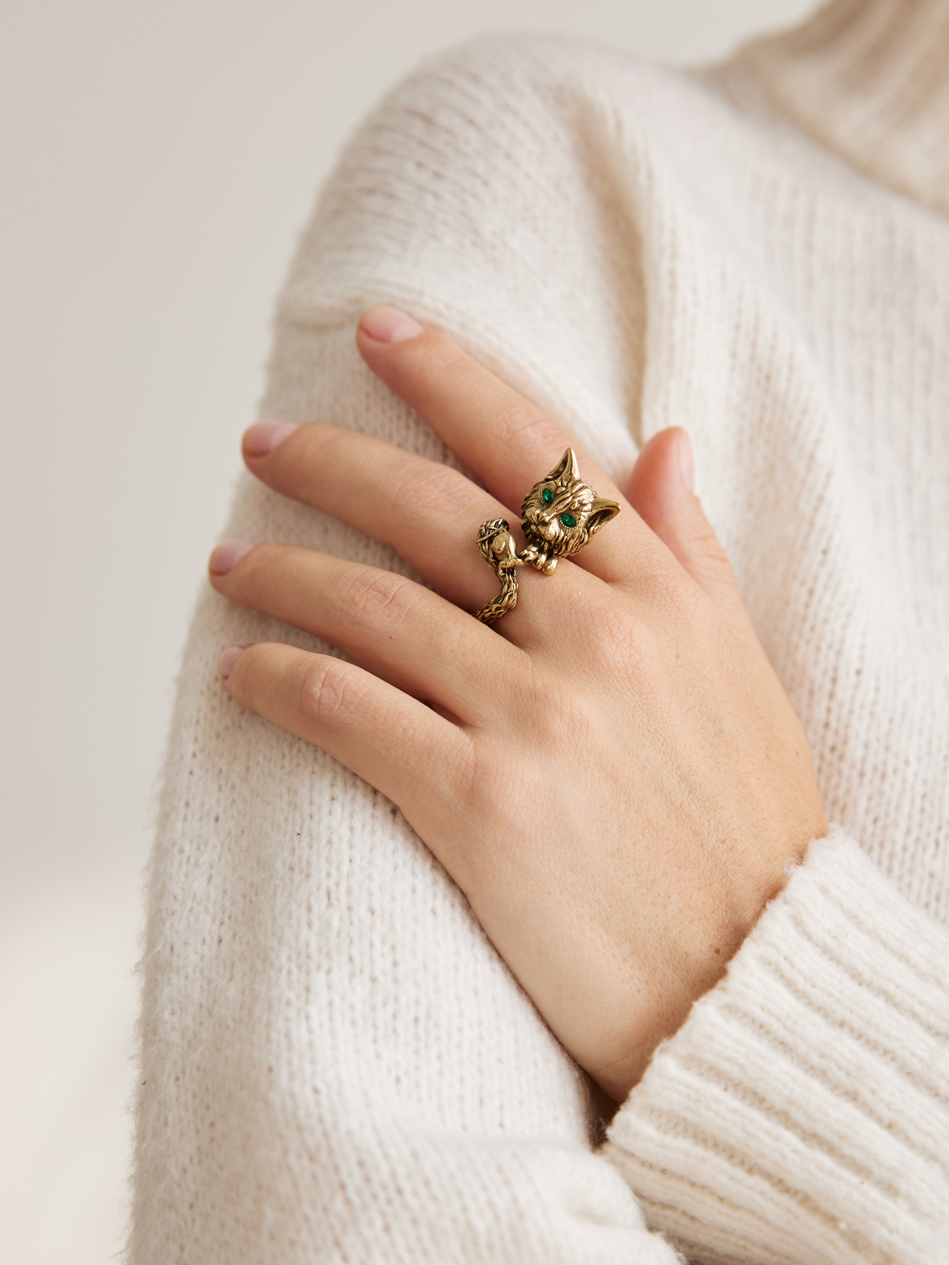 Handmade GATTO E TOPO ring. Italian design. Cat and mouse is a relationship in which the two parties closely observe each other and challenge each other. Composition: Brass (brass) with galvanic coating, patination, cubic zirkonia. Color: antique gold, green. Size: universal, the ability to arrange the shank from 17 to 18.5. Weight 17.5 gr.